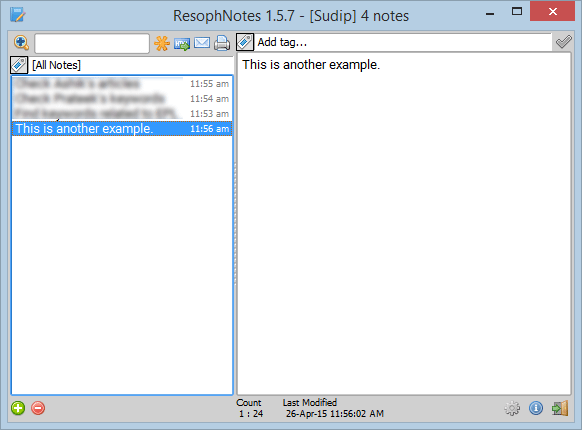 ResophNotes unterstützt Benutzer bei der Kategorisierung von Notizen nach Tags. Das heißt, wenn Sie eine Notiz für Ihr Büro erstellt haben, können Sie einen Tag hinzufügen, Office oder Work. Dies ist möglich, um beim Schreiben der Notiz einen Tag hinzuzufügen. Um ein Tag hinzuzufügen, klicken Sie einfach auf die Schaltfläche Add tag, die sich über dem leeren Feld auf der rechten Seite befindet.