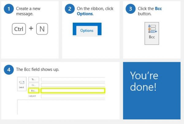 Schalten Sie Bcc in Ihrem Outlook ein, so dass die Empfänger für niemanden sichtbar sind. Um das Bcc-Feld in Ihrem Outlook zu öffnen, erstellen Sie eine neue Nachricht, gehen Sie zur Ribbon und klicken Sie auf Bcc und Sie sind fertig. Jedes Mal, wenn Sie eine neue Nachricht erstellen, wird die Option Bcc angezeigt. Sobald Sie Bcc öffnen, bleibt es gleich, bis Sie es ausschalten.