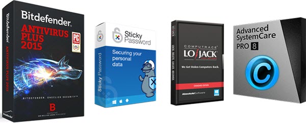 Sie erhalten Bitdefender Antivirus Plus 2015, Advanced SystemCare 8 PRO, Absolute LoJack Standard & Sticky Password Premium Software