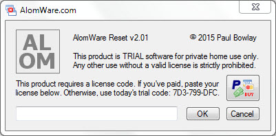 Alles, was Sie benötigen, um die Anwendung herunterzuladen, zu installieren und mit nur einem Klick zu nutzen. Wenn Sie auf das AlomWare Reset-Symbol klicken, wird ein Popup-Fenster angezeigt. Dieses Pop-up-Fenster fordert Sie zur Eingabe des Trail-Codes auf.